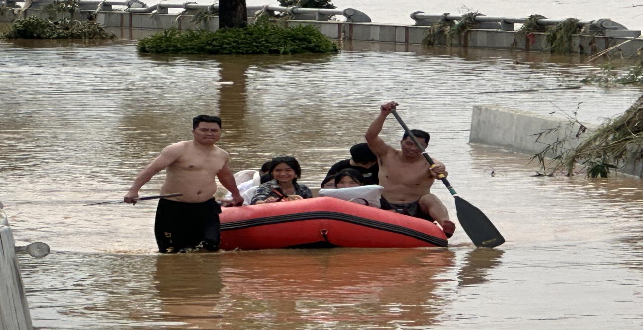 怀集体校教练欧迁琼会同县体校教练孔德艺、艺海体育跆拳道教练罗妙科利用训练用具橡皮艇转移全体师生。